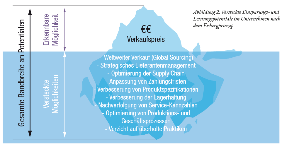 Die Gesamtheitsbetrachtung ist notwendig, um Potentiale zu nutzen, die auf den ersten Blick nicht erkennbar sind (siehe Eisbergprinzip, Abb. 2). In der Praxis wird auf volatile Marktänderungen oft mit der Anpassung des Verkaufspreises reagiert und damit Gewinnmarge reduziert. Um dieses zu vermeiden, sollte man vor einer Preisreduzierung zuerst alle Unternehmensbereiche und -prozesse auf Kosteneinsparungen und versteckte Leistungspotentiale untersuchen (siehe Abb. 2: „versteckte Möglichkeiten“). Folgende Handlungsstrategien sind im Workshop entstanden: