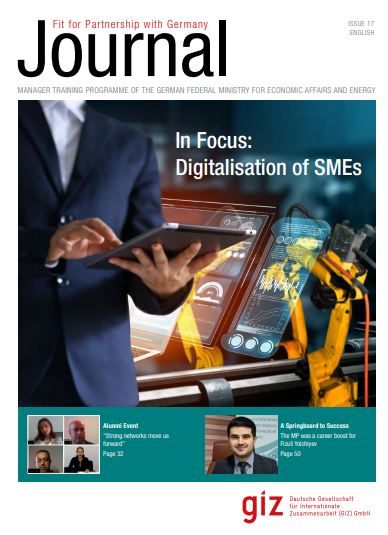 The latest “Journal” of the Manager Training Programme takes a close look at digitalisation in small and medium-sized enterprises and illustrates the chances it offers them. In addition to current developments in German SMEs, the measures provided by the German Federal Ministry for Economic Affairs and Energy to support them in the transition from analogue to digital production and work processes are described in this journal. Furthermore, strategies for effective digital marketing and successful online negotiations are introduced.