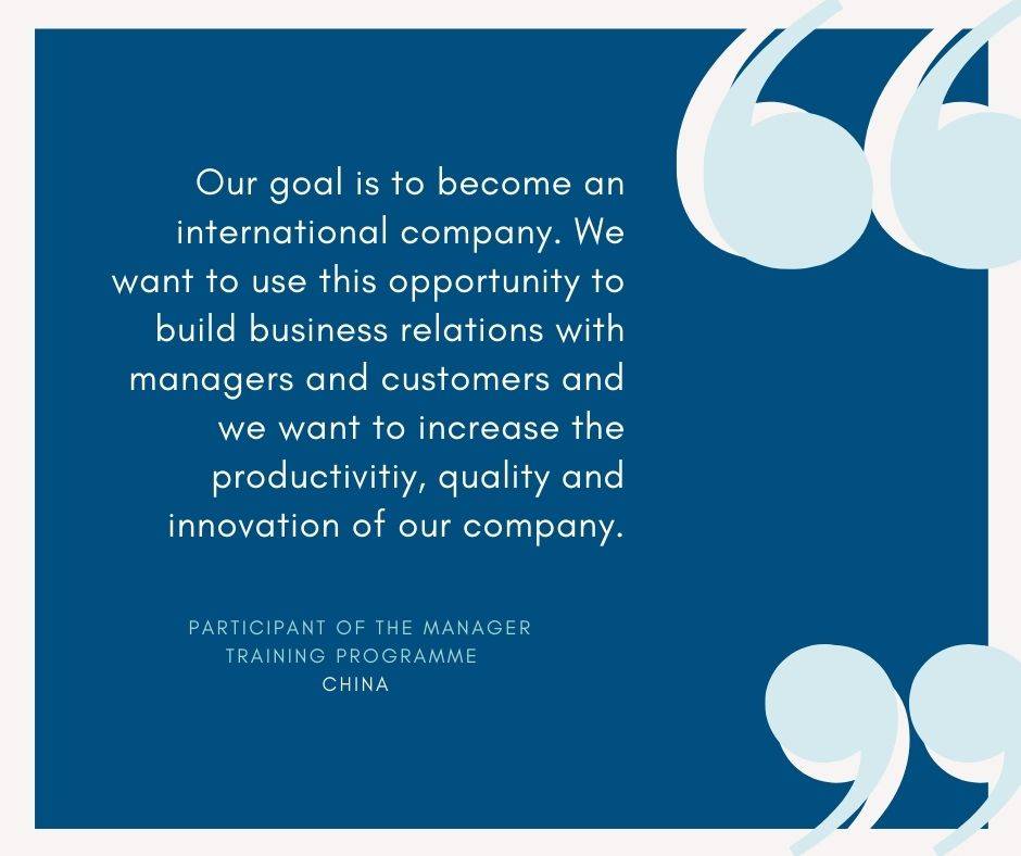The German-Chinese Manager Training Programme prepares executives from China specifically for business initiation and economic cooperation with German enterprises. Each year, around 70 Chinese executives take part in this practical training. They come from firms which have foreign trade potential that wish to establish contacts in Germany. The focus is on small and medium-sized enterprises (SMEs).