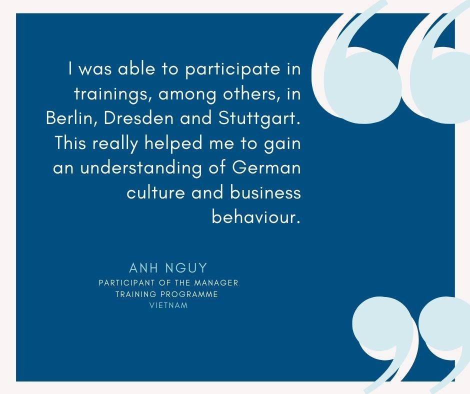 Under the motto “Fit for Partnership with Germany” the participants acquire management skills, gain insights into German business practices and establish contact with German enterprises, mainly medium-sized firms. The programme is aimed at managers and future managers, and at upper and middle management levels of Vietnamese enterprises and is generally open to all industries.