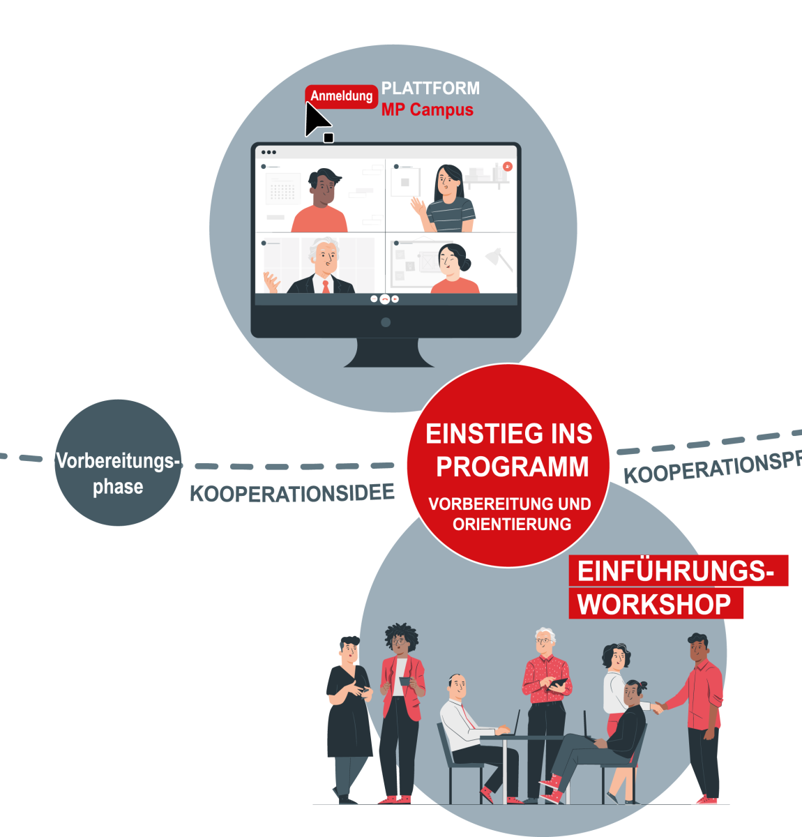 In der zweiwöchigen Einstiegsphase werden die technisch-organisatorischen Voraussetzungen für einen reibungslosen Ablauf der Fortbildung geschaffen, Erwartungen der Teilnehmenden geklärt und der inhaltliche Einstieg in das Programm gewährleistet. Dies geschieht während eines virtuellen Onboardings auf der Plattform „MP Campus“. Darauf folgt im Präsenzformat ein zweitägiger Einführungsworkshop im Heimatland, der von dem deutschen Fortbildungszentrum (FBZ) organisiert und durchgeführt wird. Im Mittelpunkt dieser Phase steht der Meinungs- und Erfahrungsaustausch der teilnehmenden Führungskräfte über ihre Herausforderungen im Arbeitsalltag und ihre persönlichen bzw. unternehmerischen Zielsetzungen. Diese sind Gegenstand des verpflichtenden individuellen Kooperationsprojekts jedes Teilnehmers und werden zu diesem Zeitpunkt auf Realisierbarkeit geprüft und inhaltlich geschärft. Zusätzlich erhalten die Teilnehmerinnen und Teilnehmer eine Einführung in die für die Kooperationsanbahnung mit Deutschland relevanten Themen. Das Kennenlernen der Mitglieder einer Gruppe untereinander dient der Bildung von Lerngemeinschaften und ist die Grundlage einer vertrauensvollen Zusammenarbeit.