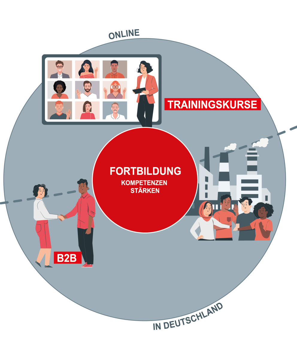 Die Fortbildungsphase wird als Wechselspiel der drei bewährten Kernelemente des MP gestaltet: interaktive und praxisorientierte Trainingskurse, themenorientierte Unternehmensbesuche und individuelle Kooperationsgespräche (B2B). Die Phase startet mit einem sechswöchigen Onlineabschnitt. Hier überwiegen die interaktiven Trainingskurse, die der Vermittlung von Wissen und seiner Anwendung in praktischen Übungen dienen. Parallel bereiten sich die Teilnehmenden auf ihre individuellen Kooperationsgespräche vor. Dem Onlineprogramm schließt sich der zweiwöchige Deutschlandaufenthalt an. Dieser fokussiert auf die direkte Erfahrung der Führungskräfte mit dem Wirtschaftsstandort Deutschland. Dies geschieht zum einen über themenorientierte Firmenbesuche in der Gruppe, wo die sie Praxiswissen deutscher Unternehmen aus erster Hand erwerben und die Bekanntschaft mit moderner Technik und Ausrüstung vor Ort machen. Zum anderen führen die Teilnehmer ihre individuellen B2B-Gespräche mit ihren potenziellen Geschäftspartnern. In den Verhandlungen wenden sie ihr erworbenes Wissen in der Praxis an. Am Ende der Fortbildungsphase verfügen die Teilnehmenden über das Handwerkszeug zur Erreichung ihrer persönlichen bzw. unternehmerischen Zielsetzungen.