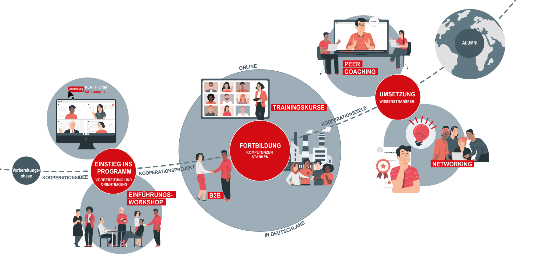 Lerneinheiten im Online- und Präsenzformat (blended learning) wechseln sich im Programm ab 2022 ab. In Lerngruppen und Lerntandems sowie durch verschiedene Coaching-Formen wird der kollegiale Austausch unter den Teilnehmenden gestärkt und als moderne Form der Kompetenzentwicklung verankert (social learning). Das Fortbildungsformat wird durch die eigens dafür entwickelte digitale Lern- und Kommunikationsplattform „MP Campus“ unterstützt. Auf ihr werden die Module der Onlinefortbildung durchgeführt und die Kommunikation der Teilnehmenden untereinander sowie eine durchgängige Lernbegleitung ermöglicht. Das Wechselspiel zwischen Onlineprogramm und Präsenz hat seinen Höhepunkt in dem zweiwöchigen Deutschlandaufenthalt. In seinem Verlauf treten die Teilnehmenden in persönlichen Kontakt mit Vertreterinnen und Vertretern der deutschen Wirtschaft. Die Fortbildung findet in Gruppen von ca. 20 Führungskräften statt. Sie gliedert sich in drei Phasen, denen eine abschließende Netzwerkveranstaltung im Heimatland folgt.