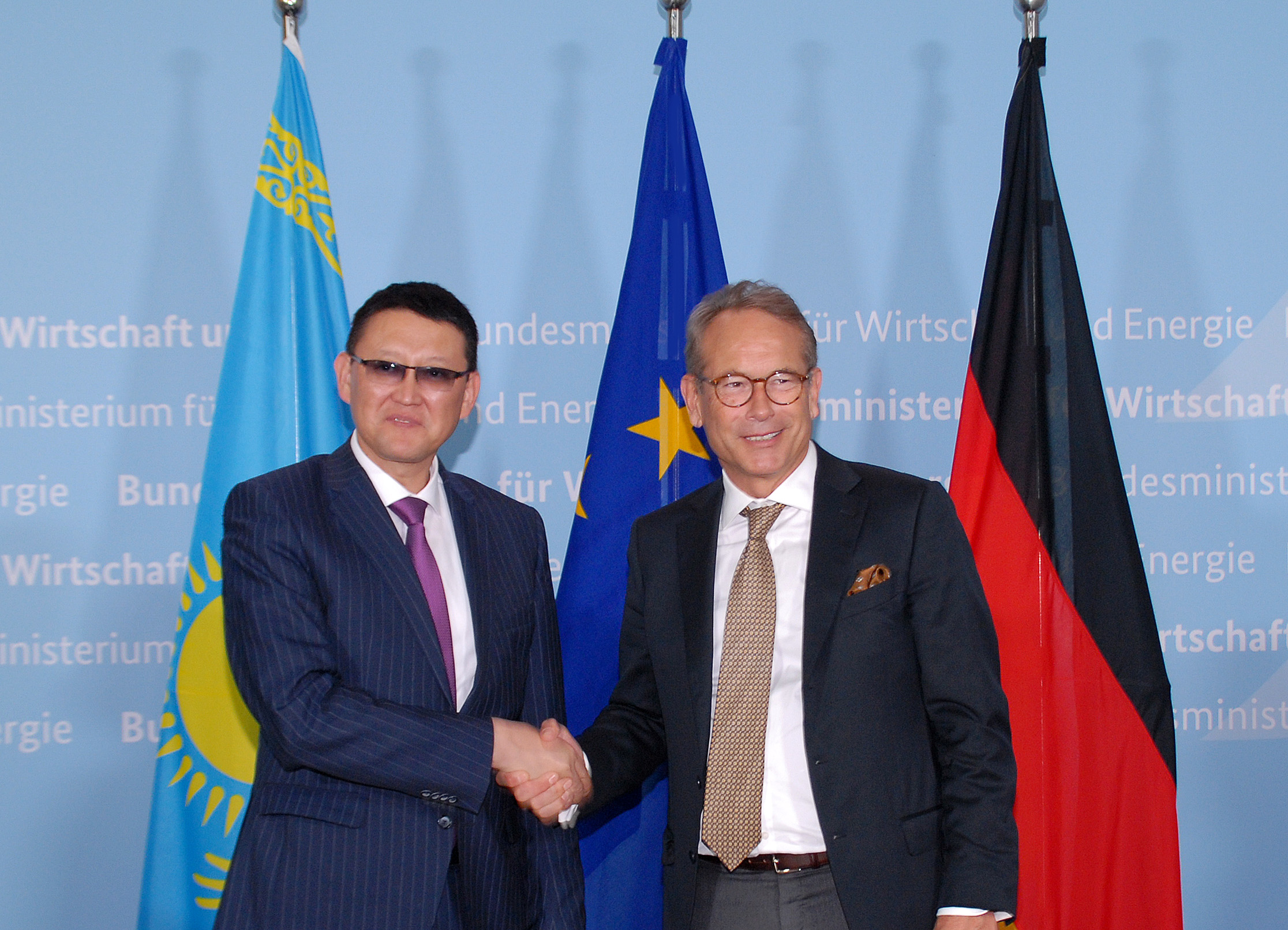 BMWi-Staatssekretär Dr. Ulrich Nussbaum, empfing am 4. Juli 2019 den Vizeminister für regionale Entwicklung des Ministeriums für Nationale Wirtschaft der Republik Kasachstan, Yermek Alpysov, zu einem Gespräch. Kasachstan ist eines der rohstoffreichsten Länder der Welt und als leistungsfähigste Wirtschaft in Zentralasien der wichtigste Wirtschaftspartner Deutschlands in Zentralasien. Staatssekretär Nussbaum dazu: „Um Handel und Investitionen zwischen Deutschland und Kasachstan weiter zu stärken, stellen wir gern unser Instrumentarium der Außenwirtschaftsförderung zur Verfügung. In diesem Zusammenhang freue ich mich über die heutige Unterzeichnung der Gemeinsamen Erklärung über die Fortsetzung der Zusammenarbeit im Managerfortbildungsprogramm. Ich bin davon überzeugt, dass wir mit diesem Programm einen konkreten Beitrag zu den von der kasachischen Regierung angestrebten Zielen zur Diversifizierung und Modernisierung der Wirtschaft leisten zu können.“