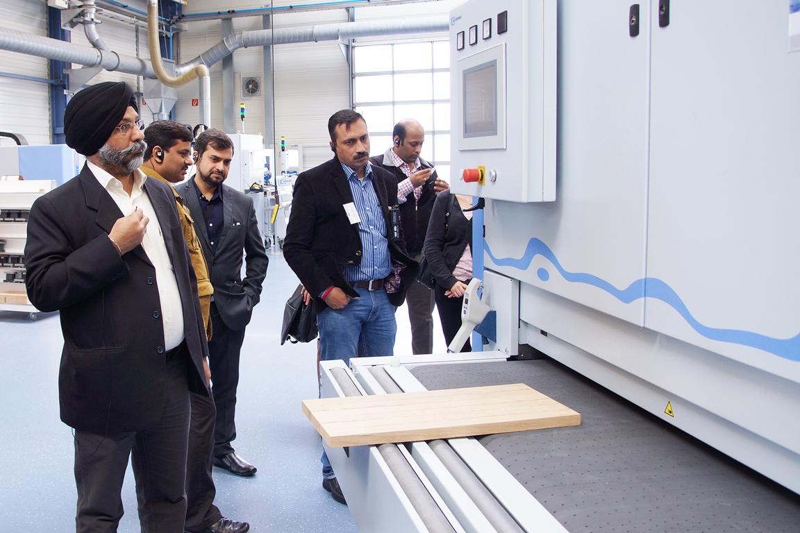 Einen Tag nach der Hannover Messe, wo sie einen Überblick über die neuesten Entwicklungen der Industrie gewonnen hatten, besuchten die MP-Teilnehmer aus Indien den Maschinenbauer. Am Standort Herzebrock fertigt das Unternehmen Maschinen für die holzbearbeitende Industrie, die weltweit in der Möbelproduktion zum Einsatz kommen. Neben CNC-Bearbeitungszentren zum Bohren, Fräsen und Sägen hat das Unternehmen Maschinen zum Setzen von Beschlägen sowie Schleifmaschinen im Produktportfolio.