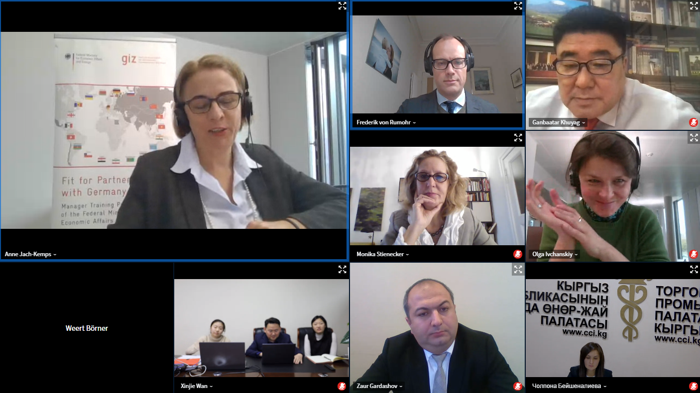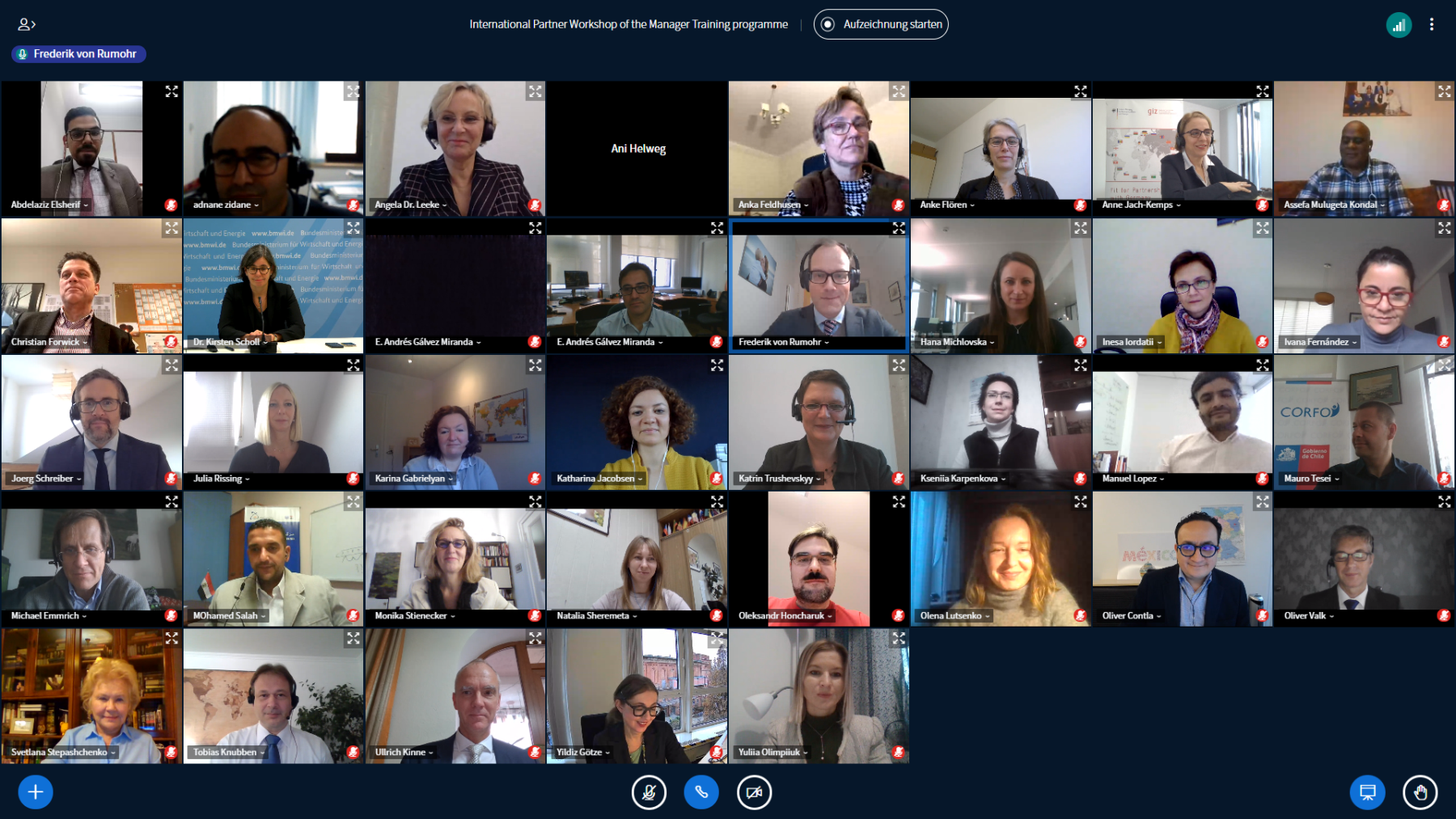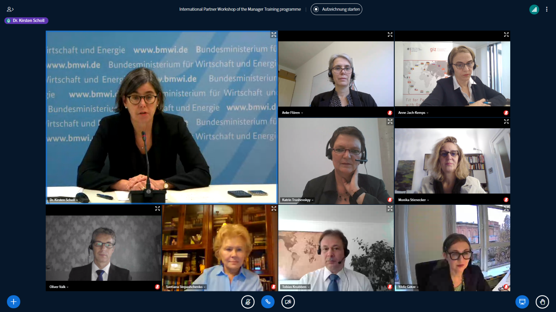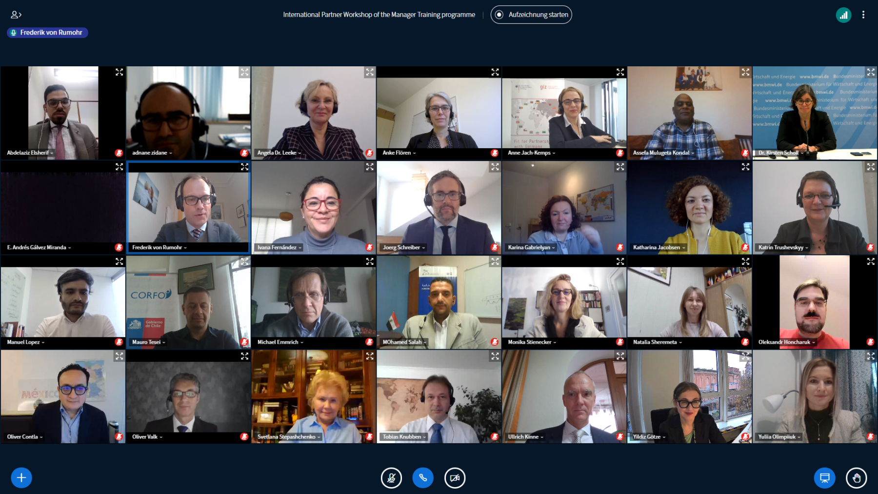 In zwei Online-Workshops trafen sich die politischen Partner und Durchführungspartner der 21 Ländern des Managerfortbildungsprogramms, um über Neuerungen im Programm ab 2022 zu diskutieren und sich über die Erfahrungen der pandemiebedingten Programmdurchführung auszutauschen. Rund 150 Teilnehmerinnen und Teilnehmer, darunter auch Vertreter deutscher und ausländischer Botschaften, fanden sich am 17. und 18. November vor den Bildschirmen zusammen. Dazu hatten das Bundesministerium für Wirtschaft und Energie (BMWi) und die Deutsche Gesellschaft für Internationale Zusammenarbeit (GIZ) eingeladen.