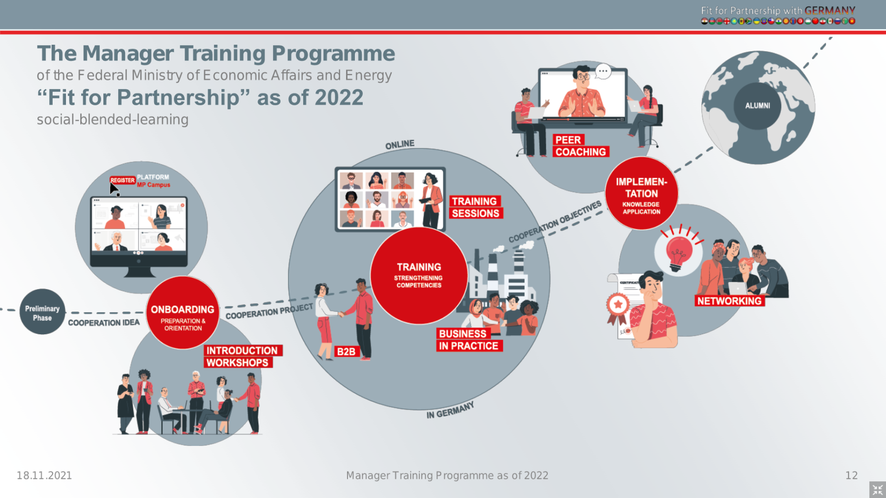 Ab 2022 geht das Programm als Social-Blended-Learning-Format an den Start, einer Kombination aus Online- und Präsenz-Modulen. Dabei werden kollegialer Austausch und kollegiale Beratung der Teilnehmerinnen und Teilnehmer untereinander zu wichtigen Fortbildungsmethoden, um Lern- und Kooperationserfolge zu erzielen. Eine tutoriell begleitete Implementierungsphase wird die Teilnehmenden dabei unterstützen, Veränderungen in ihren Unternehmen zu initiieren und ihre Kooperationspläne mit der deutschen Wirtschaft noch besser umzusetzen. Eine Netzwerkveranstaltung zum Abschluss des Programms mit Alumni des MP und Institutionen der deutschen Wirtschaft vor Ort soll dem Anspruch an langfristige, nachhaltige und stabile Netzwerke gerecht werden. Eine neu entwickelte, programmeigene Lernplattform (MP Campus), die auf die Bedarfe des Programms zugeschnitten wurde, wird der virtuellen Fortbildung, aber auch der Kommunikation der Teilnehmenden untereinander dienen.